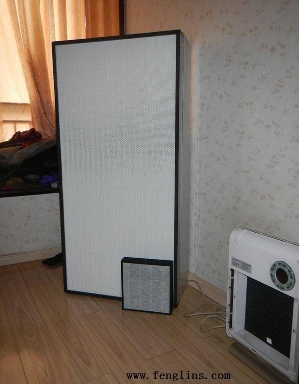 看看圖片,過(guò)濾板大小的對(duì)比效果。大白板是FFU的HEPA過(guò)濾板,角上那個(gè)是普通凈化器的過(guò)濾板。