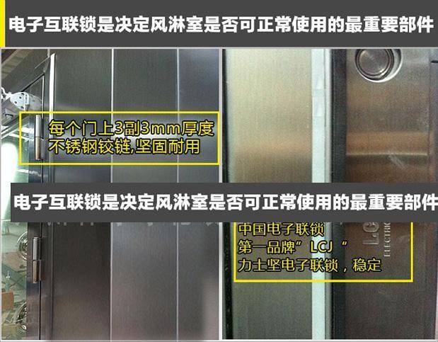 >>風淋室雙門:材質(zhì)為全不銹鋼,上部帶3C認證鋼化玻璃視窗,下部為不銹鋼平面處理,無凹凸棱角,減少死角;三道3MM厚度不銹鋼鉸鏈,保障門結(jié)實耐用,門與門框結(jié)合平整、牢固 、美觀,密封性能良好,門開啟靈活。